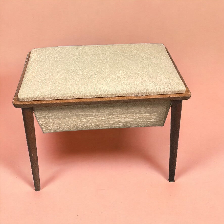 Beautiful sewing box or stool made from teak wood and synthetic leather. It's in nice vintage condition. The white synthetic leather has been recently cleaned and is in good condition, free of damage. Ideal for storing needlework projects, but also perfect for a child's room, providing additional storage space for toys.