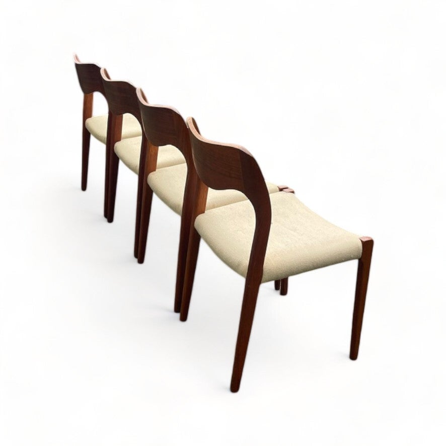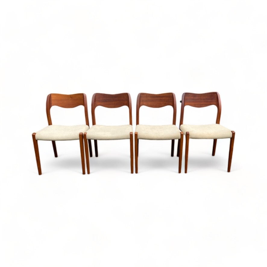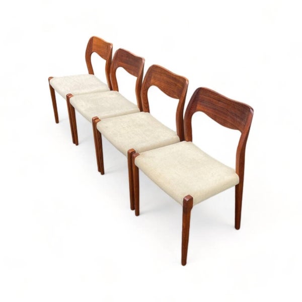 FR: Pour les conscients, amateurs de style et de durabilité, nous proposons un ensemble exclusif de 4 chaises, modèle 71, actuellement revêtues d'une étoffe en laine prête à être renouvelée. Chez nous, vous pouvez choisir un tissu Keymer élégant qui s'accorde avec votre intérieur et met en valeur le superbe cadre en teck. Le service de tapisserie d'ameublement, incluant la mousse et tous les matériaux de tension nécessaires, est inclus dans votre achat. Vous n'acquérez pas seulement une pièce de l'histoire du design, mais vous apportez aussi une touche personnelle qui rend hommage au patrimoine des années 50 et 60.