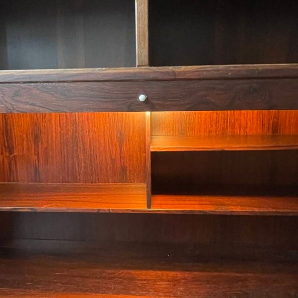 FR: Considérez la bibliothèque stylée et fonctionnelle en palissandre ; ce n'est pas seulement une vitrine pour votre collection littéraire, mais elle inclut également un volet raffiné qui révèle un espace spécial idéal pour exposer votre sélection de boissons et de verres. Cette pièce apporte l'esprit des maîtres du design danois comme Omann Jun dans votre espace de vie.