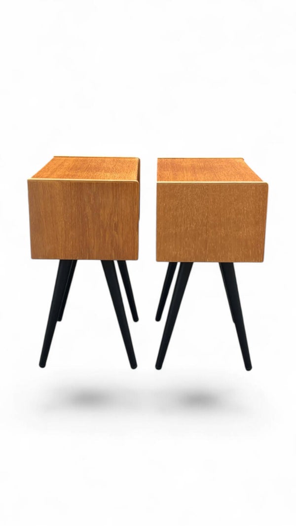 🇬🇧: Two charming nightstands set on black metal legs. The cabinets are designed sleekly, each featuring a smoothly running drawer. In a beautiful vintage condition