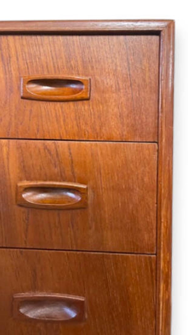 Teakhouten kast met zes laden, gebeeldhouwde verzonken grepen en slanke, taps toelopende poten. De geïntegreerde grepen en het luchtige onderstel zijn typische Deense/Zweedse details. Zeer soepel lopende laden!
