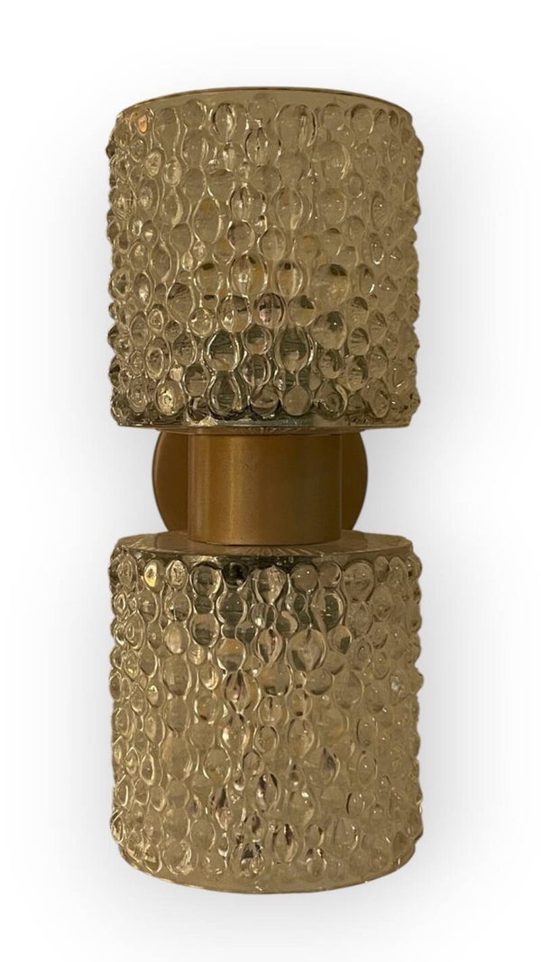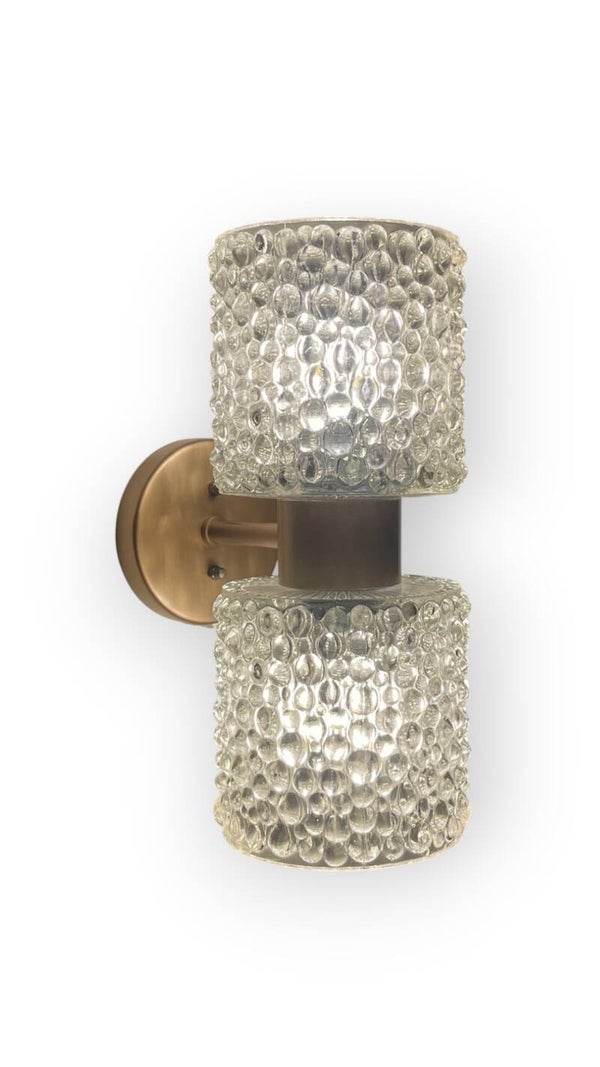 🇬🇧: Gorgeous vintage double wall sconce with two cylindrical bubble glass shades on a brass arm — likely Doria Leuchten, Germany, 1960s. The textured glass casts a magical play of light. Timeless mid-century design that brings any wall to life! ✨