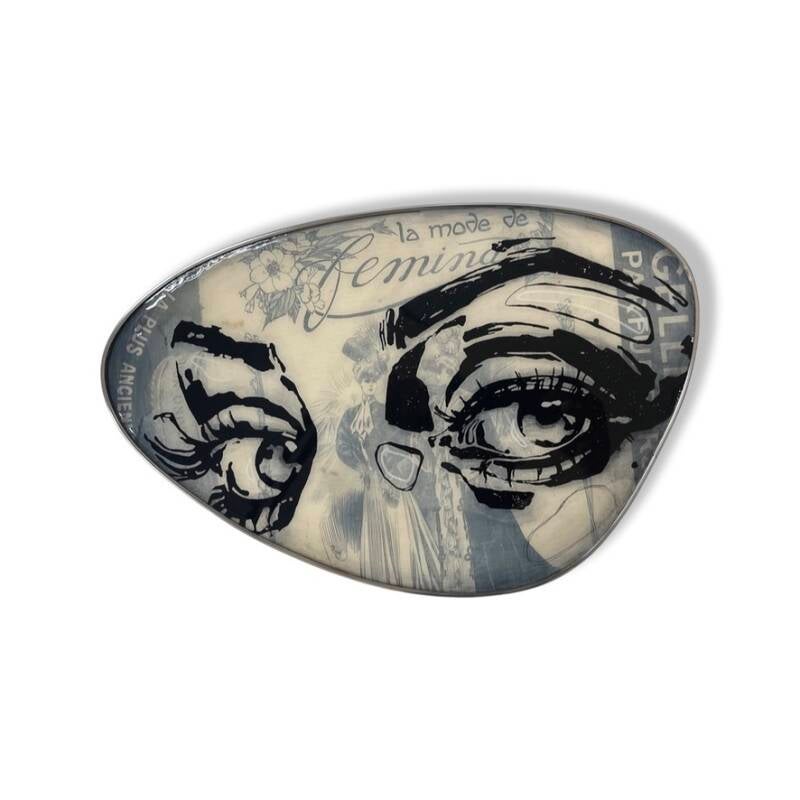 The variety of feminine organic shapes in these furnishings and the elegant tripod have inspired Maayke to approach the table tops as her canvas. The artworks are in line with the colour palette and the often female themes in her art. The artworks are composed of acrylic paint and collage of antique advertisements. All the furniture is handmade from remnants of old furniture from the 50s and 60s and thus recycled by at least 75%. The different models are based on the shapes of the original tables. The combination of the characteristic lace band and the lacquered legs in ultra matte and high gloss black make each table a feast for the eyes.